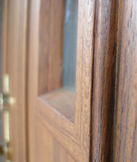 チーク材の表面仕上げのドアに木材保護オイルを施したもの(「木材保護オイル(自然塗料)」や「木質系チークオイル」)