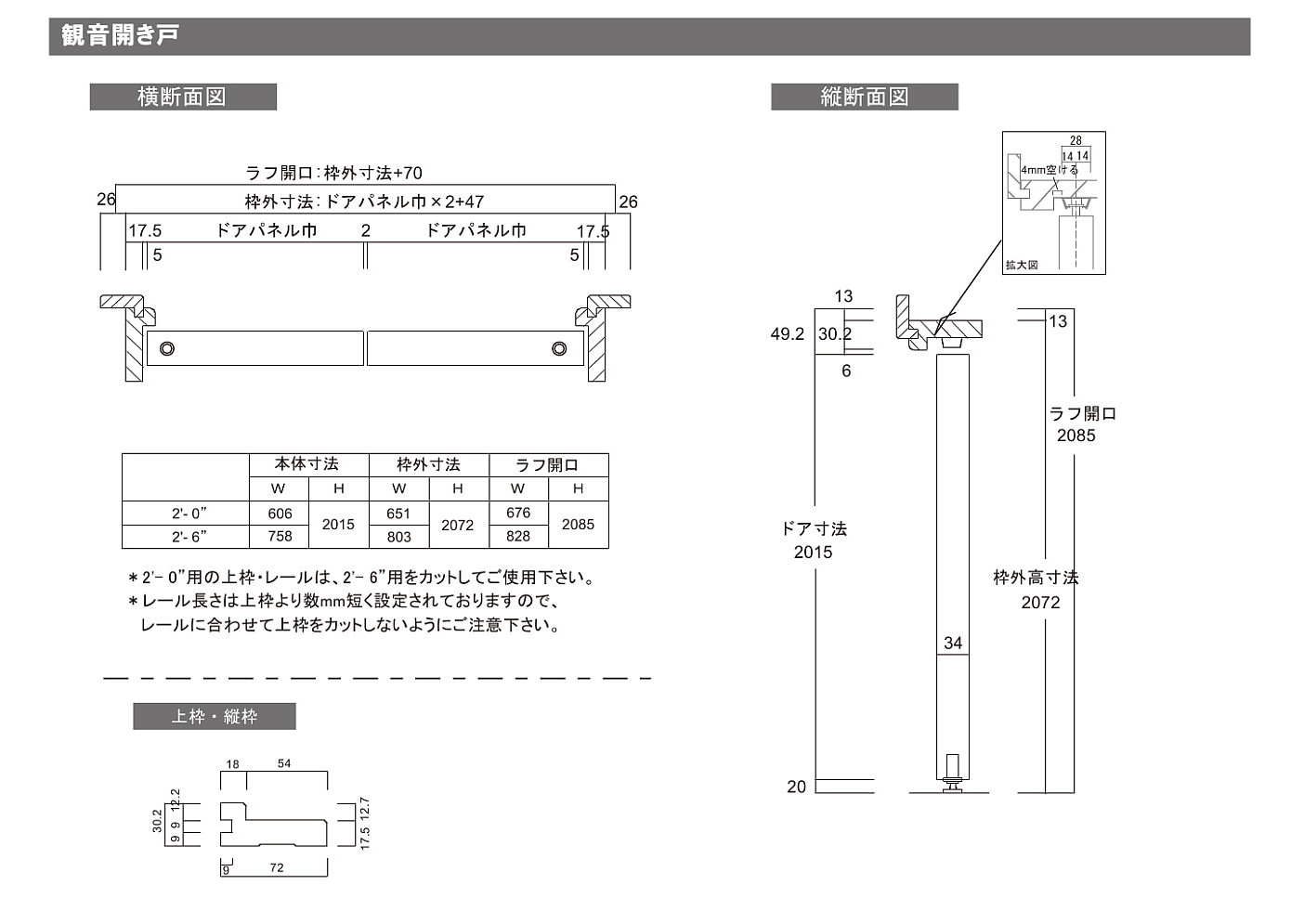 ・上枠はドアサイズW758用にセットされています。W606mmのドアをご使用の場合は現場でカットをお願いします。